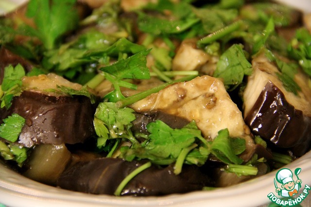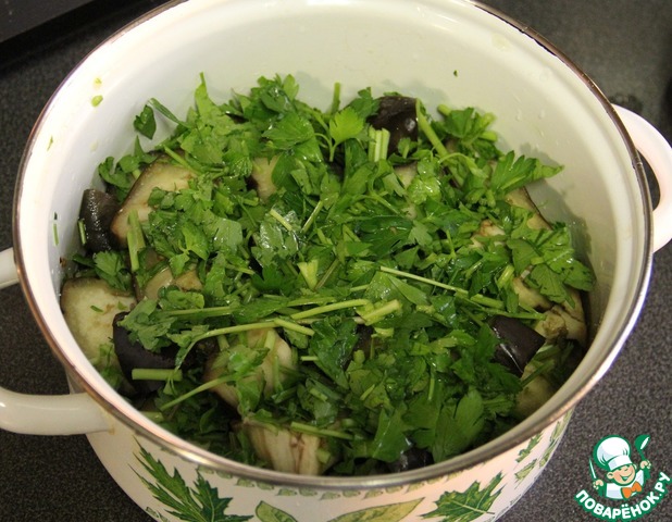 В кастрюлю укладываем слой баклажанов, нарезанную петрушку, немного соли, и сбрызнуть уксусом и соевым соусом. Затем опять слой баклажанов, петрушка, соль, уксус и соевый соус, и так все баклажаны.
