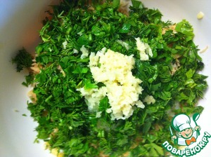 Чеснок пропустить через пресс для чеснока, зелень мелко порезать.