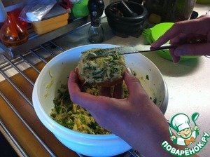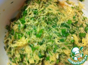 Добавить соль, перец и яйцо. Все перемешать. Если масса получится жидковатой, можно немного отжать и слить лишнюю жидкость.