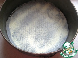 Форму для выпечки (у меня 22 см в диаметре) застилаем пергаментом, дно чуть присыпаем манной крупой.