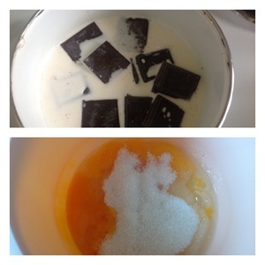 Шоколад растопить в 50 мл молока и дать остыть. Тем временем яйца взбить в пену с сахаром.