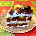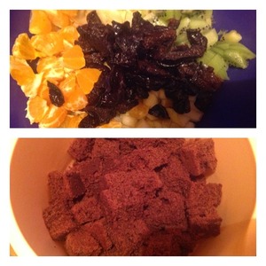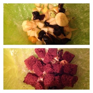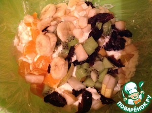 Фрукты нарезать кубиком как и чернослив. Кстати вы можете взять свои любимые фрукты или ягоды. Готовый бисквит нарезать на средние кубики