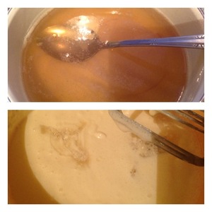 По истечении времени желатин разогреть на плите при постоянном помешивании, но не дать ему закипеть, слегка остудить, и влить в сметанный крем и взбить пол минуты миксером.