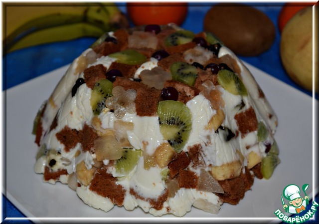 Глубокую миску или удобную вам посуду обтянуть пищевой пленкой. Выкладывать сначала фрукты, сверху кусочки бисквита.