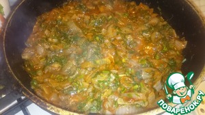 Обжариваем порезанный кубиками лук с небольшим количеством подсолнечного масла. Мелко режем зелень и добавляем к луку, пассируем 5-7 минут. Вливаем несколько столовых ложек воды и кладем томатную пасту. Продолжаем держать на маленьком огне 10-15 минут.
