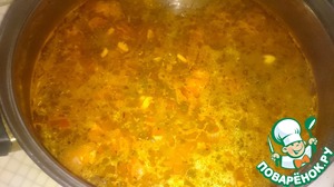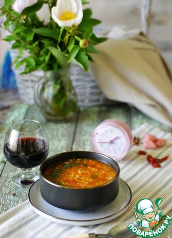 В кастрюлю к бульону и мясу высыпаем промытый рис, варим 10 минут. Добавляем нашу зажарку и продолжаем варить 10-15 минут. Заправляем суп-харчо специями (хмели-сунели, аджику, лавровый лист, соль, по желанию перец душистый), вливаем вино.