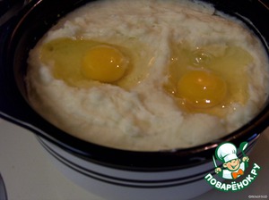 В картошке сделать ложкой углубление для яиц и вылить туда яйца.
