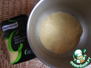 Кус-кус залить 5-ю столовыми ложками кипятка, накрыть крышкой и дать настояться 5 минут.