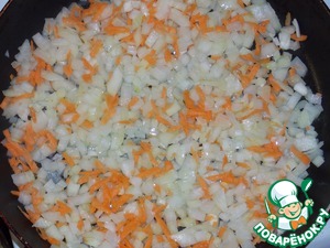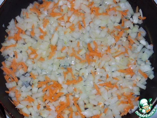 Лук порезать, морковь потереть на крупной тёрке. Всё выложить на сковородку, слегка обжарить.