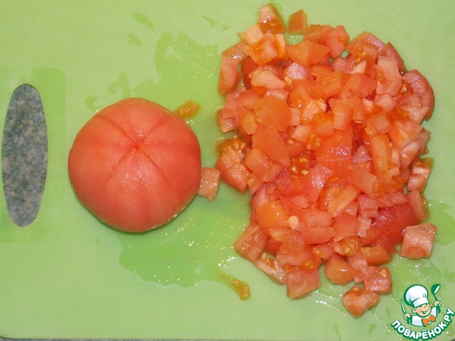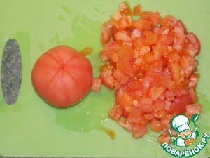 Помидоры обдать кипятком, снять кожицу. Порезать некрупными кубиками