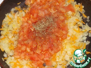Выложить помидоры на сковородку к луку с морковкой. Добавить соль, перец, базилик. Тушить на слабом огне минут 5 под крышкой.