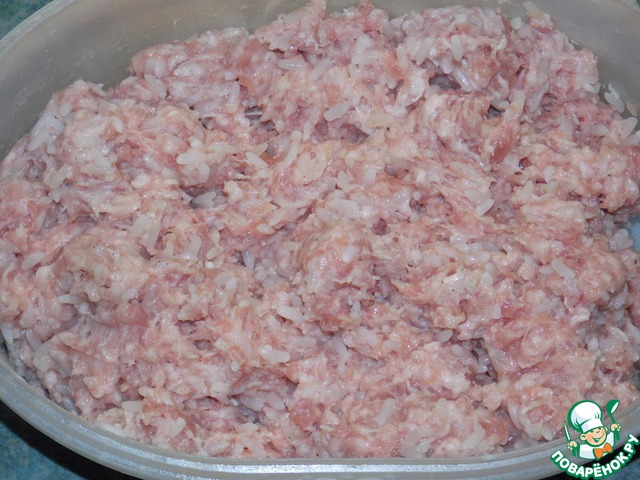 В фарш добавить рис, молоко, соль, перец. Всё перемешать.