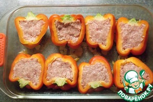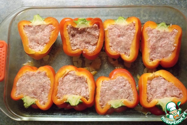 Фаршируем перцы, выкладываем на противень. На дно противня добавить чуть-чуть воды.
