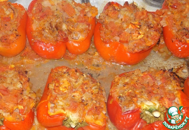 Запекать в духовке 60-80 мин. при температуре 180-200 (зависит от размера перчиков)