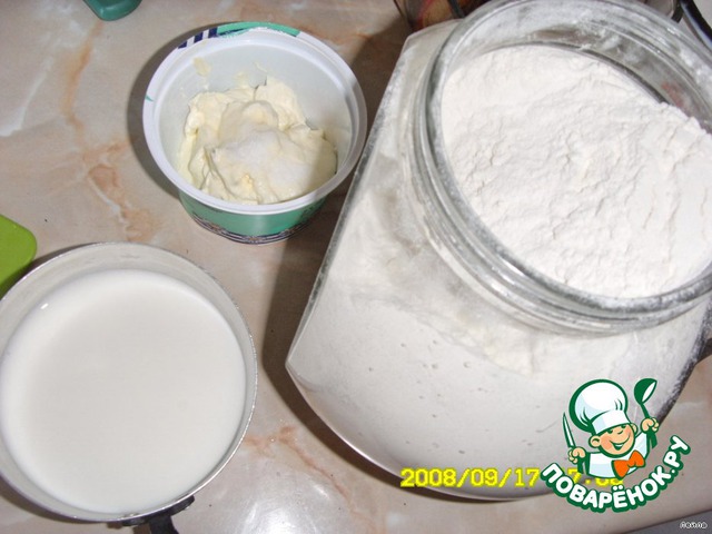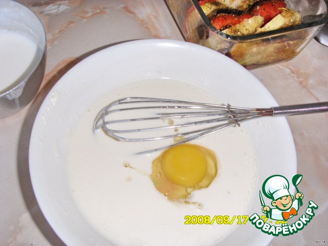 Смешать сметану с мукой и солью, постепенно вливать молоко, хорошо перемешать, после вбить яйцо и добавить мускатный орех-щепотку.