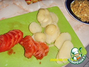 Картошку заранее отварить, остудить, нарезать дольками, помидоры очистить от кожицы, также нарезать дольками.
