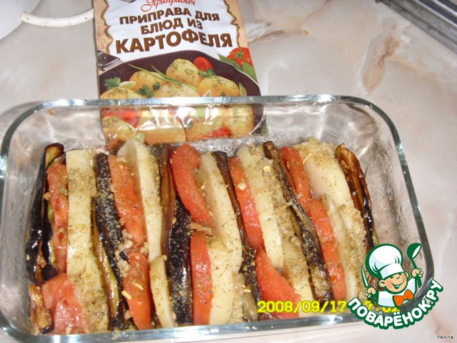 Форму смазать маслом, укладываем слоями вертикально: баклажаны, помидоры, картофель и фарш.