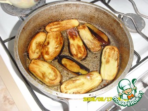 Нарезать вдоль ломтиками баклажаны заранее, посыпать солью, после промыть и обжарить.
