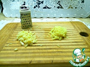 Кусочек имбиря, размером со спичечный коробок, очистить и натереть на мелкой терке. Чеснок так же очистить и натереть на терке.