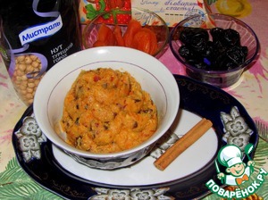 Курагу и чернослив режем на тонкие (2мм) полоски вдоль и поперёк, добавляем в нут с сахаром и корицей. Тщательно перемешиваем.