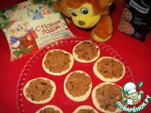 Через час тесто увеличится в объёме в 2-2,5 раза. Ещё раз вымешиваем, делим на две части. Половину прикрываем чашей от высыхания. Вторую половину теста раскатала в лист толщиной 4-5мм. и вырезала стаканом диаметром 9см. Выложила на полученные диски теста начинку ровным слоем толщиной примерно 5мм. От высыхания накрыла высокой крышкой. Раскатала и вырезала вторую часть теста. Вырезанным тестом накрыла кружкИ с начинкой. Обрезки также вымесила и тоже вырезала. Всего у меня получилось 12 крупных заготовок для булочек.