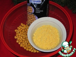 Сваренный нут измельчаем блендером, проираем через крупное сито, удалив непротёртые оболочки горошин. Получится чуть влажная "мука".