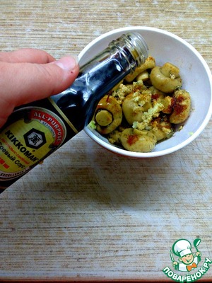 Грибы я брала консервированные. Больше похожи на варенные, поэтому сначала их надо замариновать. Выложить грибы в пиалу, добавить чеснок, пропущенный через пресс, по 0,5 ч. л. кориандра и паприки и 1/4 ч. л. сухого тимьяна. Добавить винный уксус и соевый соус.