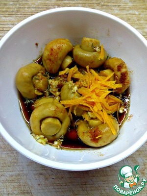 Полоски цедры нарезать тонкой соломкой и добавить к грибам. Перемешать. Оставить мариноваться часа на два, периодически перемешивая.