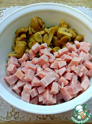Грибы, если крупные, порезать на 4 части. Ветчину порезать кубиками. Кинзу помыть, стряхнуть воду и мелко порубить. Добавить к салату.