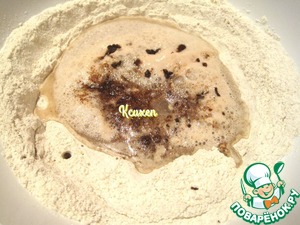 Вливаем дрожжевую смесь и солодовую заварку. Замешиваем тесто.
