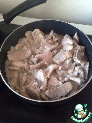 Промываем окорок. Нарезаем его небольшими кусочками и кладем в сковородку тушиться,10 мин.