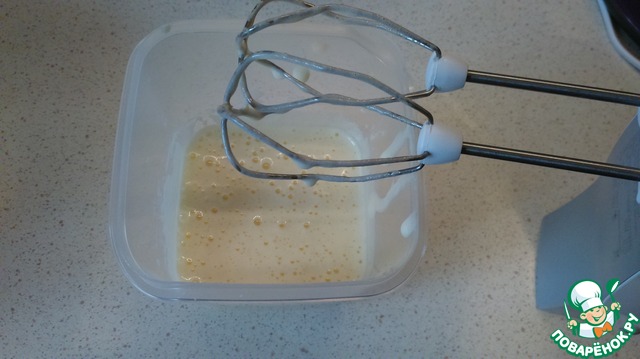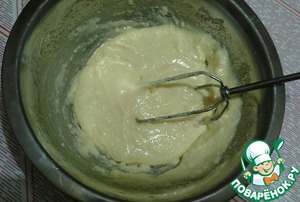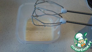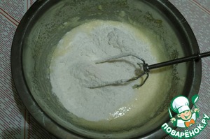 Разрыхлитель смешать с мукой и ввести в масло, размешать миксером насадками для теста.