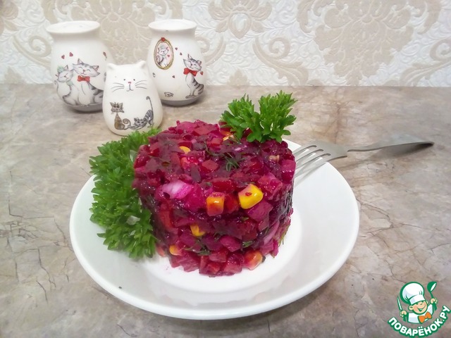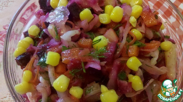 Вкусная и яркая закуска для любого времени года - салат из свеклы, лука, картофеля и моркови с кукурузой, чем-то напоминает русский винегрет, однако имеет свой неповторимый колорит и вкусовой оттенок. Он прост и полезен. Попробуйте, не пожалеете.