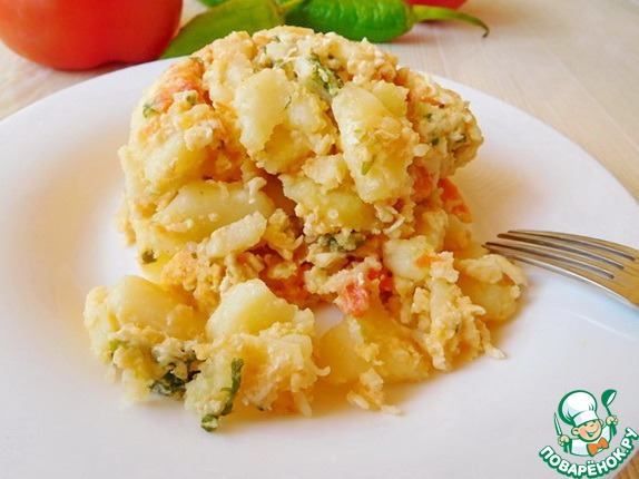 Еще через 5 минут добляем к картошке с овощами ломтики помидора.