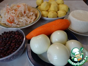 Так как дети любят вареники с картошкой и луком, я с фасолью, а муж - грузинский вариант "квари" - с сыром, а заодно и с квашенной капустой, решила выбрать следующие продукты: