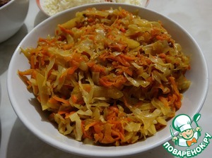 Обжариваем морковь с луком (3 шт.) до золотистого цвета, добавляем промытую и отжатую квашенную капусту, перчим по вкусу. Тушим до мягкости капусты.