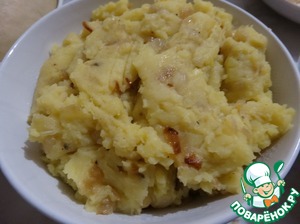 Когда картофель сварится, сливаем воду, толчем в пюре, добавляем черный перец, соль и часть жаренного лука. Перемешиваем.