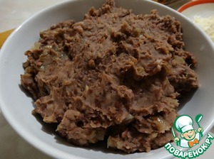 Отварную фасоль так же толчем в пюре, добавляем черный перец, соль и обжаренный лук.
