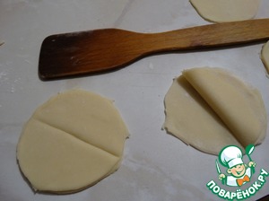 Тесто раскатываем в большую лепешку, толщиной 2-3 мм. Вырезаем круглой выемкой круги, обрезки складываем обратно в пакет.