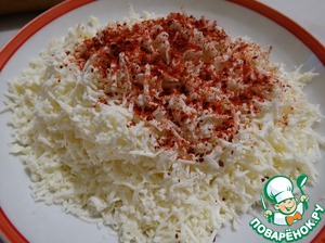 Мягкий сыр трем на мелкой терке, добавляем сладкую паприку. Если сыр не соленый, то добавляем соль по вкусу.