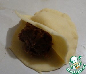 Далее помещаем начинку между двух половинок с одной стороны, закрепляем край.