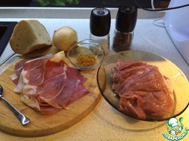 - Ветчина (Пармская сырокопченая ветчина, можно заменить копченым беконом или салом ) — 10 ломт.