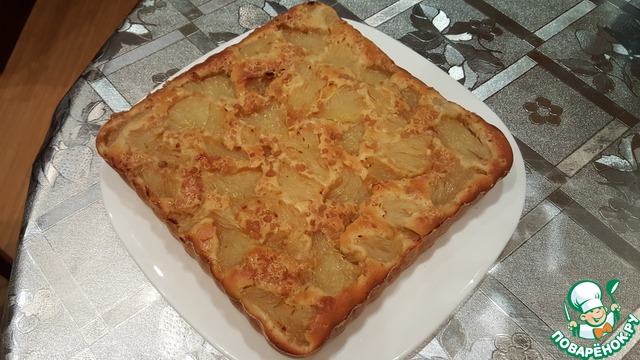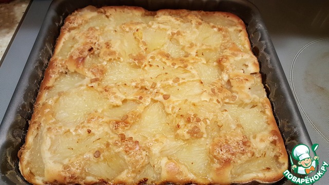Далее включаем духовку прогреваться до 180*. И чистим помело. Наш красавец был почти 2 кг весом. На пирог ушла половинка. Без кожуры вес половинки получился 750г. И выкладываем очищенный помело на тесто средними кусочками, немного притапливая. Далее я решила посыпать кекс сверху сахарными кристаллами. Отправляем кекс в разогретую духовку примерно на 40-50 минут.