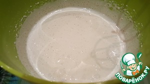 Добавить кефир, перемешать. Смешать муку, крахмал и разрыхлитель. Просеять мучную смесь к жидкой. Перемешать тесто.