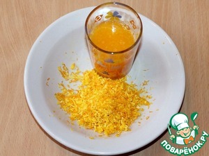1. Разогрейте духовку до 170 С. Подготовьте противень (30*20), застелите фольгой, смажьте растительным маслом. Натрите цедру апельсинов - 5 ст. л. и выдавите 5 ст. л. сока.