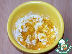 2. Взбейте блендером мягкое сливочное масло (175 г) с сахаром (1/4 стак.), и 0,5 стак. сахарной пудры, 2-3 ст. л. апельсиновой цедры, 2-3 ст. л. апельсинового сока до образования густой массы.