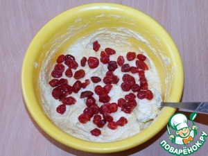 3. Сушеную вишню промойте, воду слейте, обсушите бумажным полотенцем и добавьте в смесь, перемешайте.