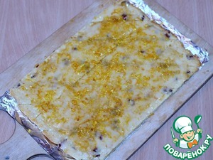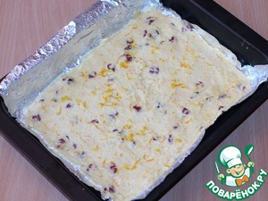 4. Распределите тесто, разровняйте на противне, толщ. 1,5 см. Выпекайте корж до тех пор, пока края не приобретут коричневый цвет, а верх - золотистый, ~30 минут. Подъем коржа при выпечке минимальный. Испеченный корж охладите немного в духовке, т. е. приоткройте немного духовку и охлаждайте.