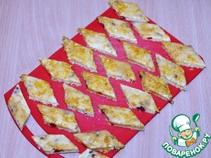 6. Переместите корж на разделочную доску. После нанесения глазури, корж становится мягким. Разрежьте корж на 3 полосы, затем каждую из них поделите на ромбики. У меня вышло 40 ромбиков-печенюшек.