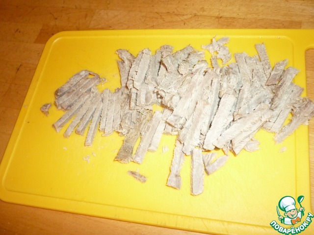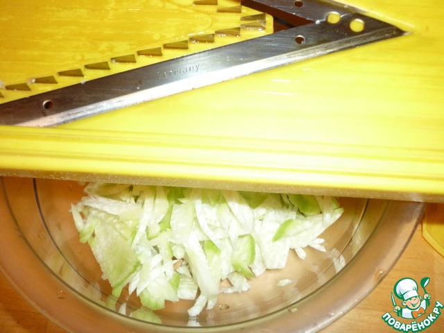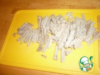 Пока идет обжарка, моем, очищаем от кожицы и нарезаем на брусочками (я на шинковке) |